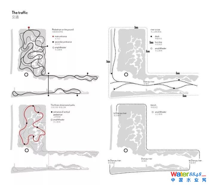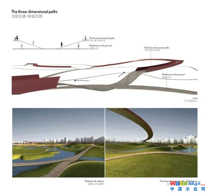 公交線路把地塊與外部城市相連,并有水運及游船?扛劭。設(shè)計沿用水渠環(huán)繞地塊周圍,限制出入口數(shù)量,以保護(hù)自然生態(tài)系統(tǒng)。立體交通路線貫穿園內(nèi),僅行人可進(jìn)入場地,并且行人也只能逗留于體驗之路,活動空間和平臺。