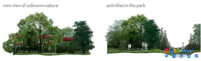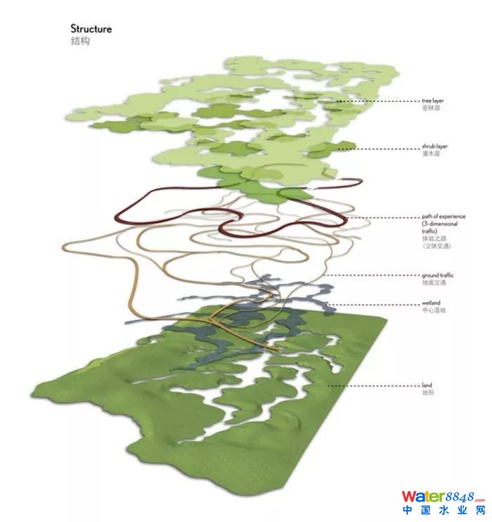 方案中的每個元素都是經(jīng)過慎重考慮的,致力于創(chuàng)造出一個生態(tài)可持續(xù)的系統(tǒng)。濕地公園由植物,水和陸地組成,在給予這些元素充分的空間之后,一條高4 米的體驗之路蜿蜒其中,帶給游客和當(dāng)?shù)鼐用癫灰话愕捏w驗。