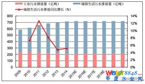 我國污水分為工業(yè)和城鎮(zhèn)生活兩部分,中國環(huán)境統(tǒng)計(jì)年鑒數(shù)據(jù)顯示,2009年-2014年我國工業(yè)污水排放量基本維持在210億噸/年左右,城鎮(zhèn)生活污水排放量自354億噸增長至510億噸。保守估算,按照工業(yè)污水排放量每年210億噸,城鎮(zhèn)生活污水排放量年增長率4%計(jì)算,則2020年我國污水排放總量將達(dá)到855億噸。2014年,我國工業(yè)污水有效處理率為96%,城鎮(zhèn)生活污水有效處理率為97%,2014年工業(yè)污水處理量為200億噸,城鎮(zhèn)生活污水處理量為495億噸。假設(shè)污水有效處理率保持不變,則2020年工業(yè)污水處理量為200億噸,城鎮(zhèn)生活污水處理量為626億噸。