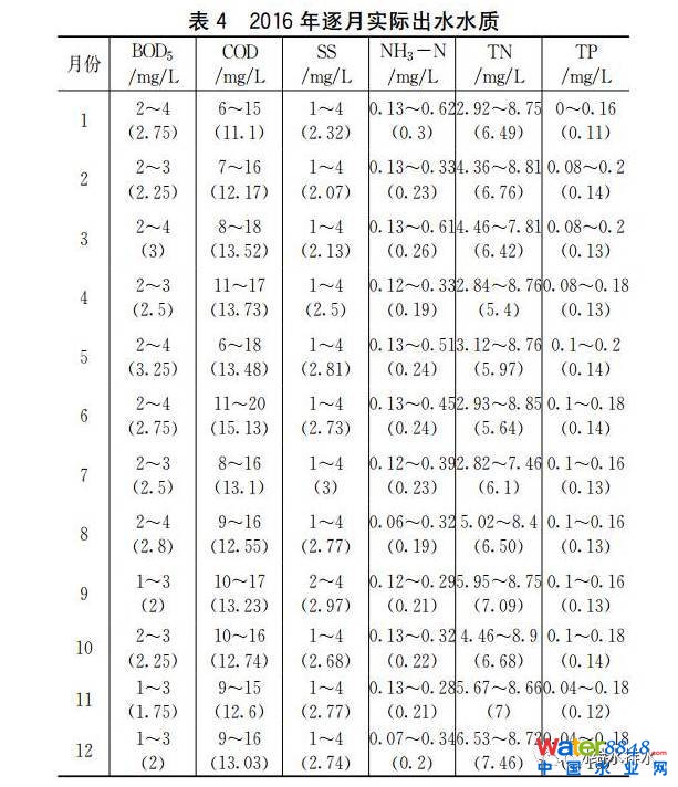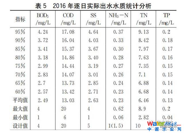 工程2016年逐月實際出水水質(zhì)見表4;對2016年逐日實際出水水質(zhì)進行數(shù)理統(tǒng)計分析,結果見表5。
