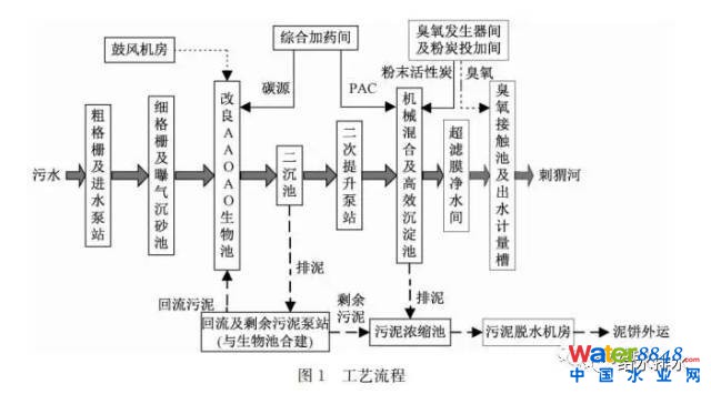 (3)深度處理工藝采用混凝+高密度沉淀池+超濾膜+臭氧工藝。該工藝集化學除磷、高效去除殘余SS和COD、脫色、消毒等多種功能于一體。
