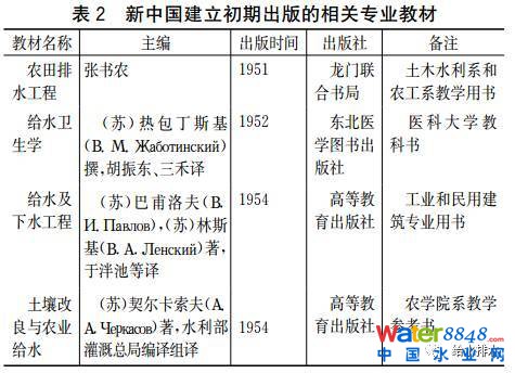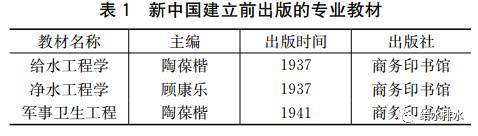 新中國建立前出版了少量的衛(wèi)生工程學(xué)科的專業(yè)教材(見表1)。在1952年專業(yè)建立之前及專業(yè)創(chuàng)辦初期,有一些相關(guān)專業(yè)或從蘇聯(lián)教材翻譯的其他專業(yè)教材(見表2)。