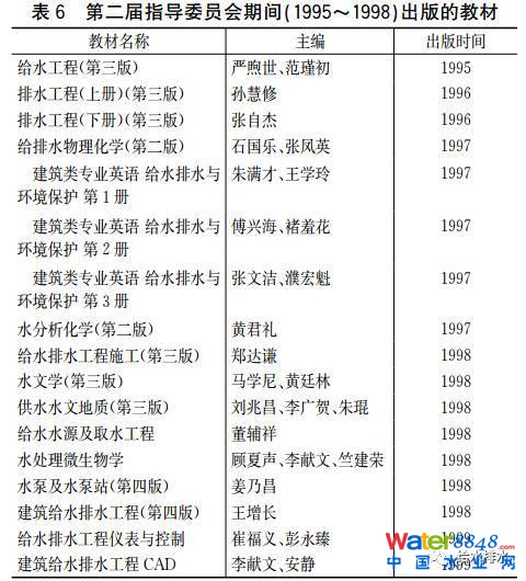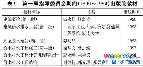 1989年,教材編審委員會更名為“全國高等學(xué)校給水排水工程學(xué)科專業(yè)指導(dǎo)委員會”。第一屆指導(dǎo)委員會主要工作仍是教材建設(shè),期間組織出版的教材有6部,見表5。