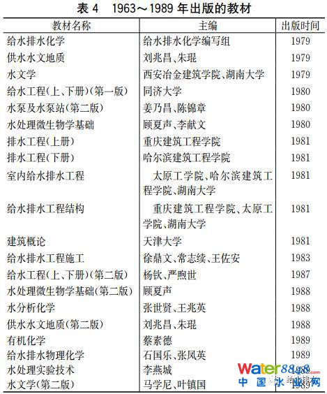 1963年建筑工程部教育司設(shè)立了給排水專業(yè)教材編審委員會,負責組織全國給排水專業(yè)教材選題、編寫和審查,在“文革”期間停止了活動。1978年教材編寫工作恢復(fù)。1981年設(shè)立城鄉(xiāng)建設(shè)環(huán)境保護部“高等工業(yè)學(xué)校給水排水及環(huán)境工程類”專業(yè)教材編審委員會,組織編寫了一系列專業(yè)課和專業(yè)基礎(chǔ)課的統(tǒng)編教材。1963~1989年間共出版教材20部(見表4)。(本文中表4~表11所列教材皆由中國建筑工業(yè)出版社出版)