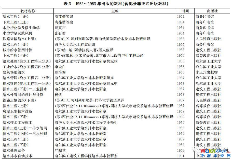 1952年后,為了解決給排水專業(yè)教材急需的問題,一些高校和政府主管部門組織翻譯出版了一批蘇聯(lián)教材,同時也編著出版了一批教材,為給排水專業(yè)的教學(xué)提供了基礎(chǔ)(見表3)。