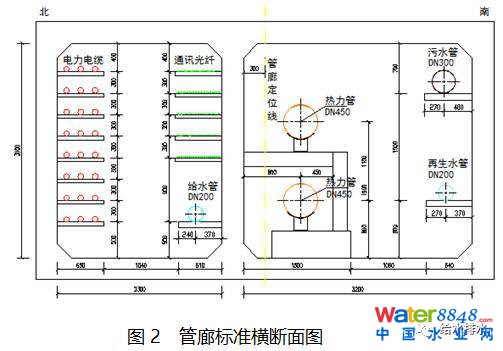 根據(jù)該項目的特點,道路北側(cè)設有電力開閉所,為了便于出線井的設置,電力艙室放在北側(cè),供熱艙室放在南側(cè)。