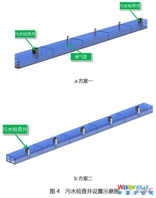 方案一是采用建筑室內(nèi)排水模式,即針對污水管道的通氣要求,每隔一定距離設通氣管保持與大氣聯(lián)通,每隔一定距離設置檢查口與清掃口以保障管道日常檢修與疏通,通過順水三通銜接支管與主管;方案二采用市政排水模式,每隔一定距離設置檢查井。以上兩種方式均存在一定不足。