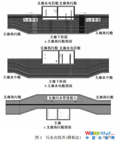 降板法出線,即在污水出線位置管廊底板下臥,除污水外,其余管線沿底板下臥,上部空間為污水單獨使用,并根據(jù)需要將頂板局部下降,以便于污水支管的預留以及檢查井的設置(見圖3)。