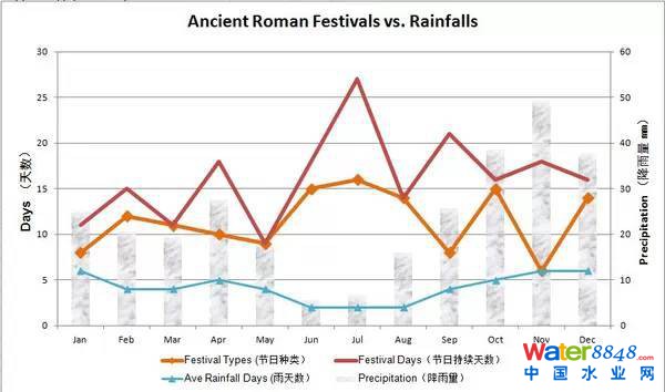 如果把羅馬的降雨量(借用現(xiàn)在的數(shù)據(jù))和古羅馬有記錄的節(jié)日種類(lèi)和持續(xù)時(shí)間(Roman Festivals)做一個(gè)比對(duì)的話,就會(huì)類(lèi)似下面的圖表: