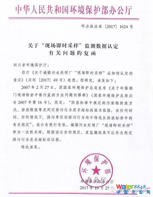 環(huán)保部復(fù)函:城鎮(zhèn)污水處理廠“現(xiàn)場即時采樣”即為一次性采樣,其監(jiān)測結(jié)果可以作為判定排污行為是否超標(biāo)的證據(jù)