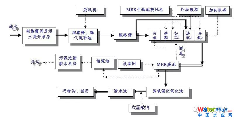 按照對各種主要出水指標(biāo)的工藝方案的分析,結(jié)合實(shí)際工程的特點(diǎn),按照現(xiàn)在社會影響普遍能夠接受的方式,設(shè)計了地下處理廠,采用MBR工藝,此工藝是多級AO+MBR+臭氧+高級氧化工藝流程。