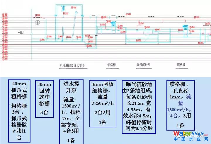 下面通過一個流程圖對參數(shù)做一個概述,抓爪式粗格柵40mm,有3臺,回轉(zhuǎn)式中格柵3臺,進(jìn)水提升泵是按照系數(shù)設(shè)計,地下部分開始的細(xì)格柵是4毫米的,細(xì)格柵后面是曝氣沉砂池,它的峰值停留時間能夠在8分鐘以上。沉砂池后面是一毫米的孔狀膜格柵。