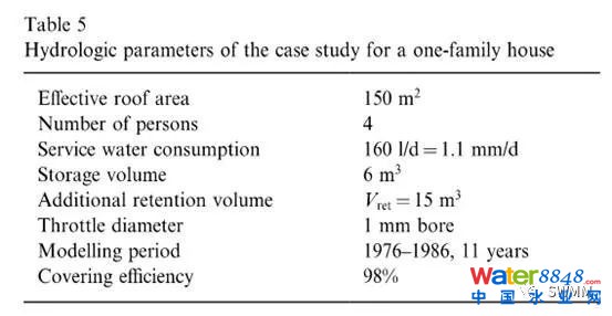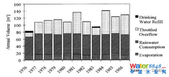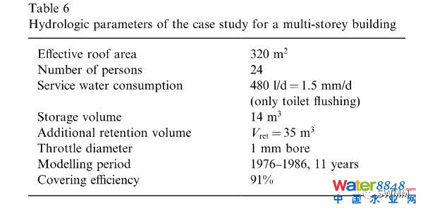 單戶和多層住房兩種類型的建筑在1976年到1986年間的年水量平衡得到了計(jì)算。在這兩個(gè)案例中,雨水存貯池都附加提供了lmm節(jié)流閥的調(diào)蓄容積。表格56給出了建筑的各個(gè)參數(shù)。水量平衡包括降雨,屋面的濕潤損失,蒸發(fā),雨水使用,節(jié)流閥的溢流水量和飲用水補(bǔ)水。