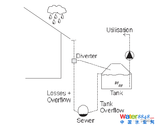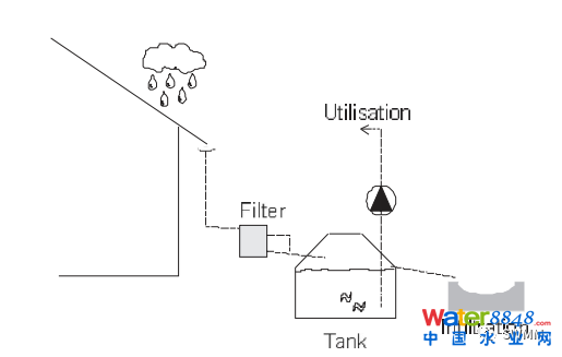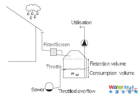 在建筑中安裝的一座典型雨水利用系統(tǒng)通過提供沖廁和綠地用水來節(jié)約飲用水,當(dāng)被安裝在私用住宅時(shí),它還要提供洗滌用水。圖1展示了雨水收集利用系統(tǒng)的原理。屋面徑流機(jī)械地通過過濾器或者格柵進(jìn)行粗略收集。市場上提供了許多各種各樣的雨水收集系統(tǒng),能夠根據(jù)水力特性對它們進(jìn)行系統(tǒng)分類: