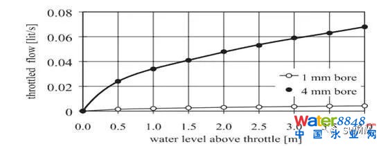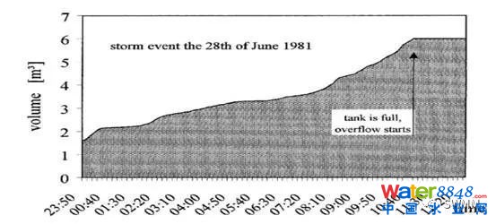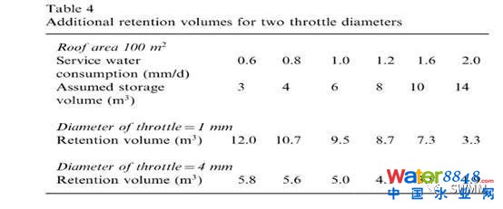 為了避免水池完全充滿后會出現(xiàn)溢流的缺點(diǎn),人們在貯存池中引入了附加的調(diào)蓄容積(Mall-Beton,1999b)。通過對模擬期間最極端降雨情景下的水位過程線(圖13)和水池中的水位圖(圖14)的檢驗(yàn)結(jié)果,說明了貯水容積對徑流產(chǎn)生的影響。附加的9.5m3調(diào)蓄容積會將溢流量削減至0。表格4給出了與節(jié)流閥直徑為1mm4mm相對應(yīng)的調(diào)蓄容積。根據(jù)Torricelli1646)的描述,節(jié)流閥是帶有尖端小圓孔的裝置。圖15描述了受水位控制的節(jié)流流量。當(dāng)想達(dá)到95%-99%這樣高的系統(tǒng)效率時(shí),才需要表格4中給出的相對應(yīng)的高用水貯存體積。對于普通住戶,經(jīng)濟(jì)合理的貯存容積不超過6m3/100m2Ar。當(dāng)需要灌溉用水時(shí),應(yīng)該提高水池的貯存能力。為水池溢流提供調(diào)蓄容積的其它可能方法是在水池的周圍區(qū)域建造碎石床(Mall-Beton,1999b)。由于土壤的滲透能力在以后會成為限制性因素,所以不采用局部土壤閥門滲透的方法。