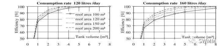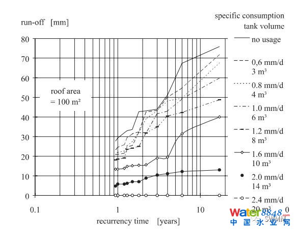 9顯示了在一系列的貯水容積定額中,水池溢流量與日用水量定額的比例關(guān)系。對于四人入住且其屋面面積達(dá)到100m2的房屋建筑,如果沖廁用水需求量為25L/(人·d,則可以減少44%的屋面徑流,且只需要1m3/100m2水池容積。,當(dāng)用水量很高時(shí),水池容積則增加到5m3/100m2,剩余的溢流量可以削減到少于徑流容積的15%。