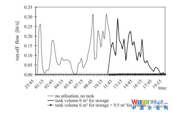 13 對屋面面積Ar=200m和特定用水量1mm/d10年模擬過程中最強(qiáng)降雨的徑流水文過程線