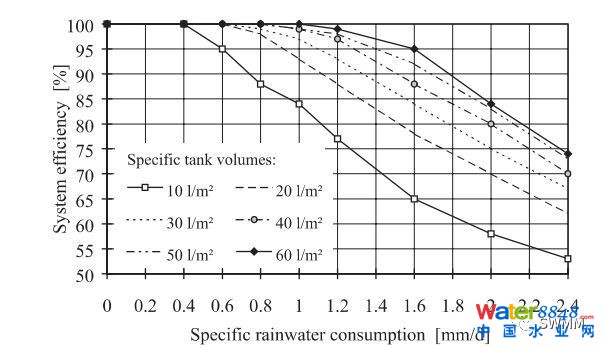 家用平均水量取決于設(shè)備使用年限,家用設(shè)備的類型,變化范圍為100-145L/(人·天)Herrmann Schmida,1996年;HMUEB,1994)。圖6描述了一系列工業(yè)水用水效率所對應(yīng)的系統(tǒng)效率、貯存容積和屋面面積之間的關(guān)系。為了將不同的日用水量和屋面面積簡化到一個(gè)參數(shù)組中,有必要在日用水量Qd(1/d)和有效屋面面積之間建立關(guān)系Qd/Ar=Qs,得到的日用水量定額Qs的單位為mm/d。貯水容積V與屋頂面積Ar相關(guān),可以得到貯水容積定額Vs=V/Ar,它也被用于確定集中式分布雨水調(diào)蓄池的尺寸。得到的數(shù)據(jù)在圖7中進(jìn)行了描述:這里你發(fā)現(xiàn)系統(tǒng)的效率與用水速率相關(guān),而不受屋面范圍的影響。對于使用4-6m3貯水容積的單獨(dú)用戶來說,飲用水的平均節(jié)水率在30%60%之間,這取決于用水習(xí)慣和有效屋面面積。當(dāng)?shù)玫阶畲蟮南到y(tǒng)效率時(shí),我們可以從表格3中獲取所需要的水池容積。圖8給出了在居住有兩個(gè)年輕人和兩個(gè)孩子的建筑中檢測到的用水?dāng)?shù)據(jù),他們居住在位于巴伐利亞州法蘭克尼亞市上游的米斯特巴赫市。