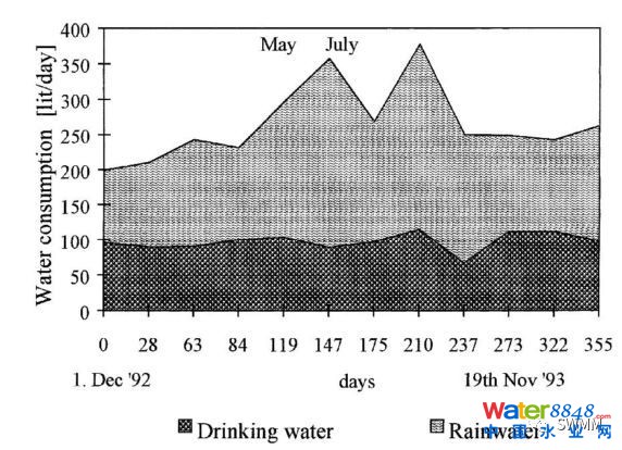 1993年巴伐利亞州法蘭克尼亞市上游米斯特巴赫市四人住房的日用水量。貯水容積6m3,屋面面積Ar=150m2.平均總用水量(=雨水加飲用水)=66L/(人·d(數(shù)據(jù)源自米斯特巴赫的B.Koppe)。