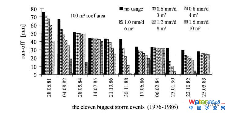聯(lián)合表格3中最大的覆蓋率,圖10給出了溢流容積和溢流事件次數(shù)之間的關(guān)系。對于排水系統(tǒng),我們更感興趣的是它在強(qiáng)降雨期間的運(yùn)行效能。因此,我們分析了在10年的模擬過程中發(fā)生的11次最大徑流事件。圖11給出了在這些極端降雨事件中所得到的徑流容積減少量?梢圆斓讲煌姆磻(yīng):在用水速率為1.6mm/d時(shí)沒有徑流事件發(fā)生:19881130日,1981628日和1990123日。其它的徑流事件得到增強(qiáng)或減弱:1985714日,198426日和1984528日。這些反應(yīng)是由于在暴雨事件之前貯存池中的雨水量水平所導(dǎo)致的。圖12分析了一定的徑流容積在相應(yīng)周期下所對應(yīng)的的徑流削減量。周期是根據(jù)經(jīng)驗(yàn)頻率公式得到的。即使10年周期這樣的極端事件,當(dāng)運(yùn)行雨水利用系統(tǒng)時(shí),徑流容積會得到大量的削減。