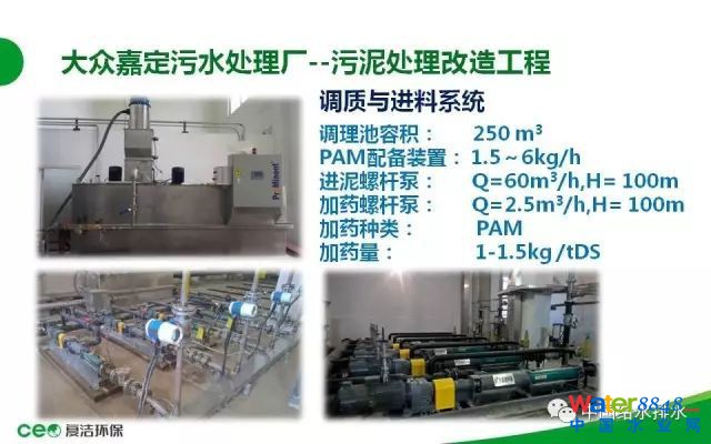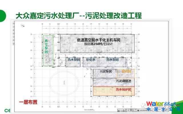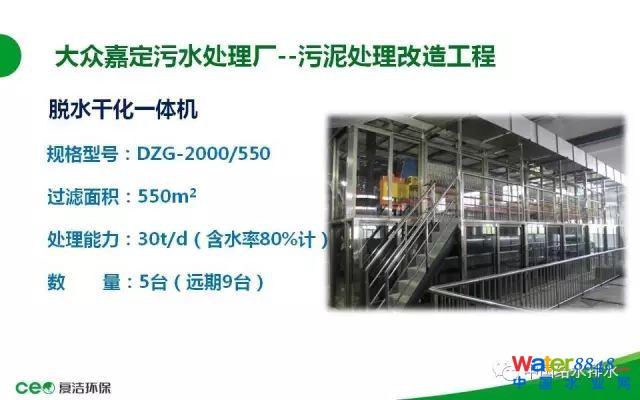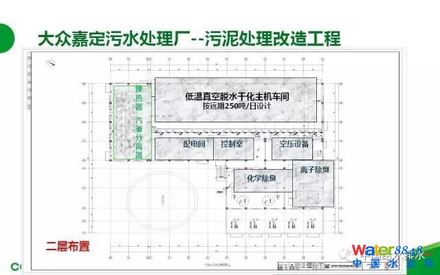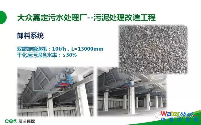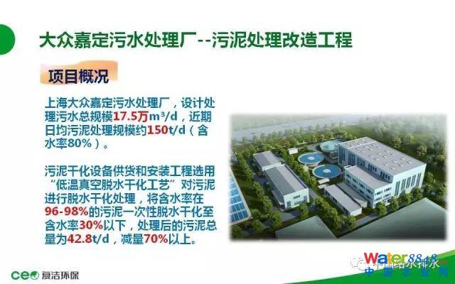 下面我介紹一個近期的工程案例。大眾嘉定污水處理廠:這是上海大眾嘉定BOT運(yùn)行的污水處理廠,污水廠的設(shè)計(jì)污水處理規(guī)模是17.5萬噸,分三期建設(shè),現(xiàn)在三期已經(jīng)建設(shè)完成了。近期的污泥處理規(guī)模是150噸,就是17.5萬噸的水,150噸的泥,污泥干化設(shè)備的供貨安裝,這是一個標(biāo)段,采用低溫真空脫水干化工藝,原泥96-98%一次性脫水干化至含水率30%以下,處理以后的污泥總量理論計(jì)算是42.8噸,減量71%左右。