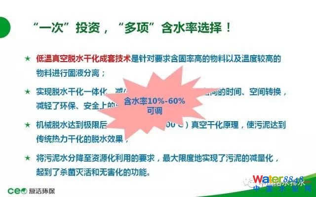 再增加一個系統(tǒng)就是真空系統(tǒng),污泥中的水分常壓下需要一百度以上才能沸騰汽化。熱源只有80度左右,所以提供一個低壓的環(huán)境,就是增加一個真空環(huán)境。這個技術(shù)集合脫水和干化一體化,從源頭進(jìn)行減量,避免污泥的大量外運(yùn),包括降低了一些外運(yùn)過程中的環(huán)境污染等等。那我們也是采用模塊化的設(shè)計(jì),根據(jù)項(xiàng)目建設(shè)的規(guī)模包括進(jìn)度,一次性設(shè)計(jì)、靈活分期建設(shè),后面有一些案例可以體現(xiàn)這一點(diǎn)。因?yàn)樗撍苫癁橐惑w,直接運(yùn)行成本更加低廉,;只添加少量常規(guī)的絮凝劑,藥劑成本低。熱源,我們采用熱水作為熱源,在項(xiàng)目建設(shè)階段,可以多途徑的去選擇熱源的組成,可以選擇低品位的余熱蒸汽,煙道氣,或者配置天然氣的鍋爐等等。