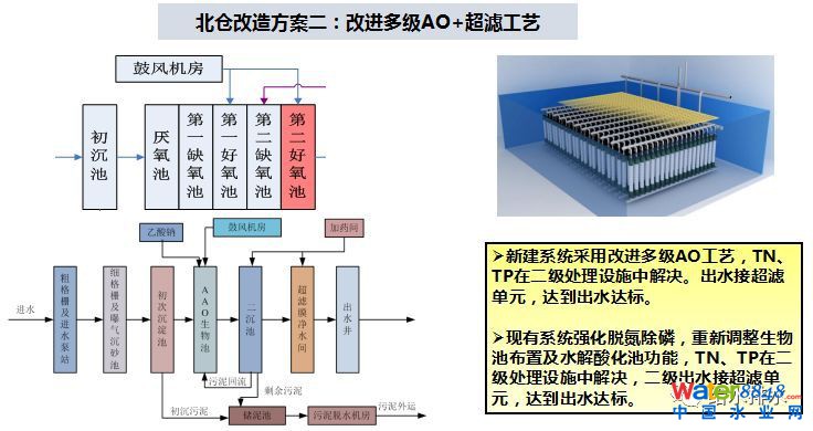 推薦采用“改進多級AO工藝+反硝化生物濾池+高密度澄清池+V型濾池+臭氧高級氧化工藝方案”。