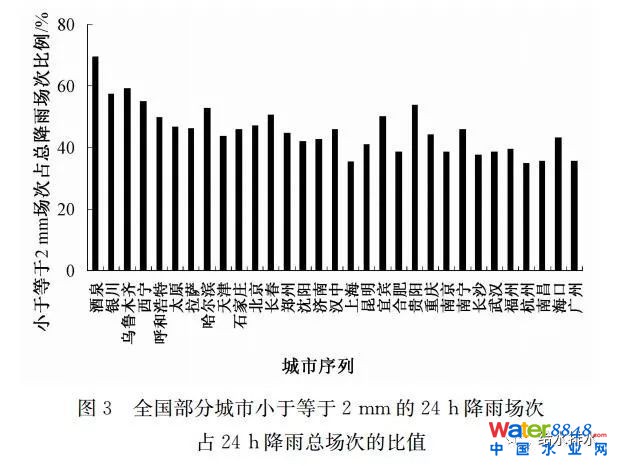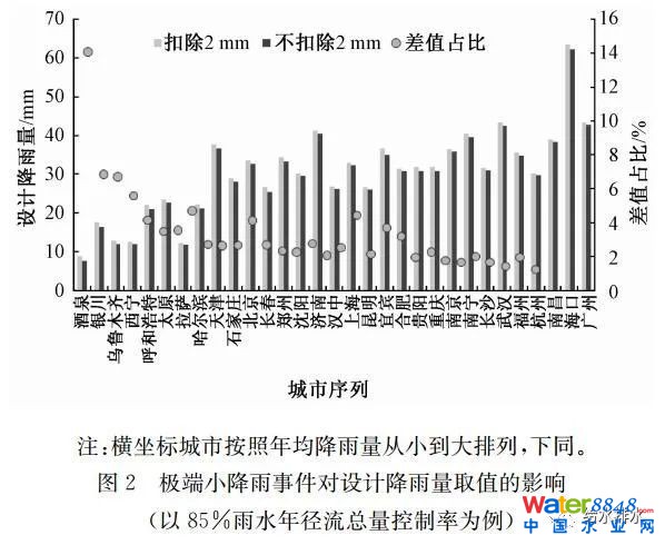 (1)極端小降雨事件的雨量不能滿足植被截流、洼地蓄水、土壤下滲的損耗,在產(chǎn)生徑流前已經(jīng)損失殆盡。雨水年徑流總量控制率與24 h降雨場次控制率的統(tǒng)計中是否扣除極端小降雨事件應(yīng)分別考慮。從雨水年徑流總量控制率的角度看,如果保留小于等于2 mm的極端小降雨事件,全國31個城市85%雨水年徑流總量控制率對應(yīng)設(shè)計降雨量的減小值平均為0.9 mm,其中最大的為1.3 mm(?冢、最低為0.4 mm(拉薩);差值占比平均為3.4%,其中最大為14.0%(酒泉)、其次為6.8%(銀川),最小為1.3%(廣州)。極端小降雨事件對雨水年徑流總量控制的統(tǒng)計結(jié)果影響較小。