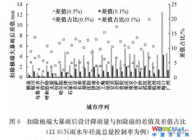 如圖8所示,統(tǒng)計全國31個城市扣除與不扣除極端大暴雨事件(末端頻率為0.5%與0.1%兩種)下,85%的雨水年徑流總量控制率對應(yīng)設(shè)計降雨量取值,計算前者與后者的差值及差值占比(差值占扣除前設(shè)計降雨量的比例)。