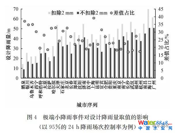 采用PERCENTILE函數(shù)統(tǒng)計法,統(tǒng)計全國部分城市扣除極端小降雨事件與不扣除極端小降雨事件下,95%的24 h降雨場次控制率對應(yīng)設(shè)計降雨量的取值。計算前者與后者的差值及差值占比(差值占扣除后設(shè)計降雨量的比例)。結(jié)果顯示31個城市設(shè)計降雨量的減小值平均為10.6 mm,其中最大的為19.0 mm(?冢、最低為3.9 mm(拉薩);差值占比平均為25.8%,其中最大為39.1%(宜賓)、最小為17.0%(杭州)。