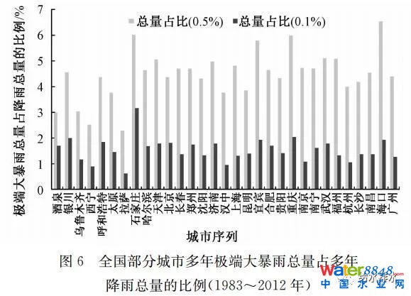 極端大暴雨事件的場次數(shù)少卻貢獻(xiàn)了較高的徑流總量,圖5、圖6分別統(tǒng)計了全國31個城市的多年(1983~2012年)累計的極端大暴雨總數(shù)與總量占比(極端大暴雨總量占多年降雨總量的比例)。統(tǒng)計結(jié)果表明,當(dāng)以末端頻率小于0.5%的降雨事件作為極端暴雨事件,31個城市30年累計的極端大暴雨總數(shù)平均為8.8場,總量占比平均為4.5%,其中最高為6.5%(海口),最低為2.3%(拉薩);當(dāng)以末端頻率小于0.1%的降雨事件作為極端暴雨事件,31城市30年累計的極端大暴雨總數(shù)平均為1.8場,總量占比平均為1.5%,其中最高為3.1%(石家莊),最低為0.6%(拉薩)。
