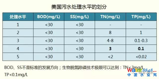 這是美國(guó)污水處理的水平分級(jí),一二三四五,BOD、SS沒變,只有氮磷在變。