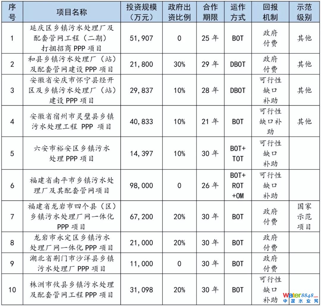 目前我國關于鄉(xiāng)鎮(zhèn)污水處理設施已經出現一批PPP項目,其投資規(guī)模通常在3-6億元,主要采取BOT運作方式,部分存量項目涉及TOT存量運作,政府出資持股比例為10-30%,PPP回報機制為主要為政府付費,合作期限通常在25-30年。詳情如下表所示: