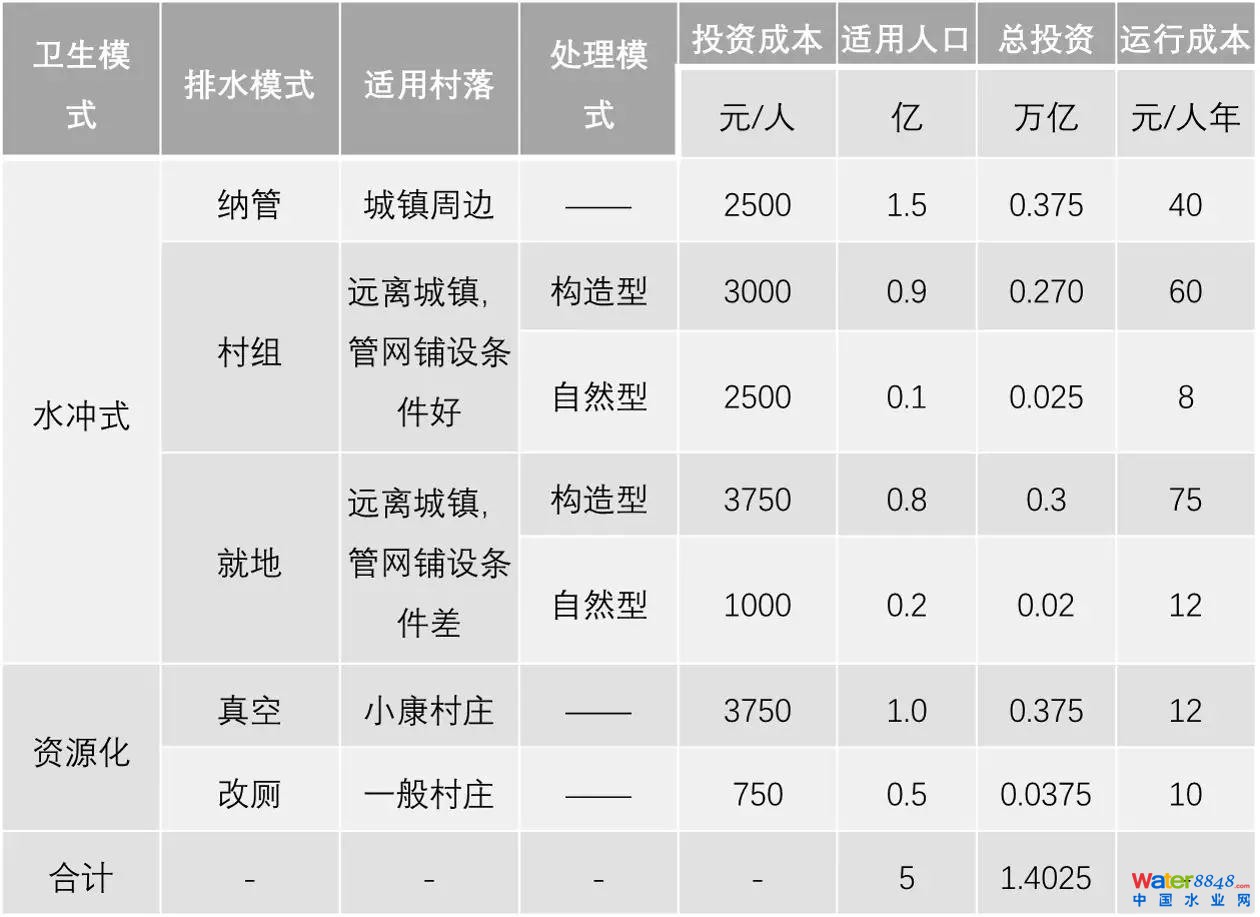 綜合這兩種測(cè)算結(jié)果,預(yù)測(cè)我國(guó)鄉(xiāng)村污水治理的實(shí)際投資需求有希望控制在1.4萬(wàn)億~1.8萬(wàn)億之間。必須說(shuō)明的是,這一預(yù)測(cè)目標(biāo)必須在產(chǎn)業(yè)發(fā)展、技術(shù)應(yīng)用與管理都相當(dāng)完善的情況下才能實(shí)現(xiàn)。如維持現(xiàn)狀水平,我國(guó)實(shí)現(xiàn)鄉(xiāng)村污水治理目標(biāo)的總投資可能會(huì)突破3萬(wàn)億。