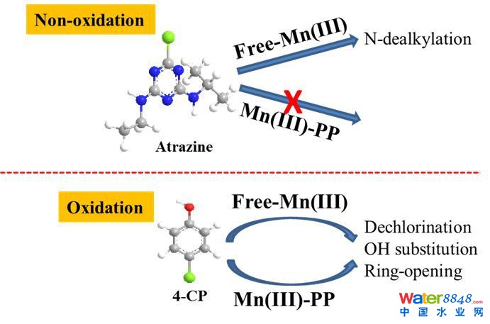 該研究探討了游離態(tài)Mn()與有機(jī)物(以阿特拉津和4-氯酚為例)的反應(yīng)機(jī)制,揭示了催化和氧化兩種截然不同的有機(jī)污染物降解機(jī)制。Mn()由亞硫酸氫鹽活化高錳酸鹽的過程中產(chǎn)生,其通過β-消除機(jī)理促進(jìn)了阿特拉津的有效N-脫烷基化,但氧化還原反應(yīng)并不完全。相比之下,游離態(tài)Mn()與羥基自由基(OH)一樣,通過分子內(nèi)氧化還原過程降解4-氯酚,實(shí)現(xiàn)脫氯、羥基取代、開環(huán)及礦化。此外,Mn()與焦磷酸鹽絡(luò)合之后,反應(yīng)物之間的電子和質(zhì)子轉(zhuǎn)移無法實(shí)現(xiàn),因此焦磷酸鹽與Mn()絡(luò)合使其不能與阿特拉津結(jié)合并反應(yīng)。這些結(jié)果的揭示為理解富含錳礦的地球化學(xué)環(huán)境下或利用錳氧化物進(jìn)行水處理過程中的有機(jī)物降解過程的認(rèn)識開拓了思路。
