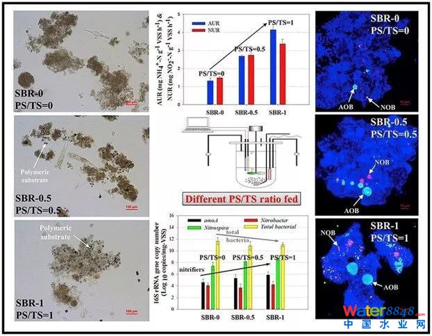 該研究揭示了污水中聚合態(tài)基質(zhì)(PS)與污水生物處理系統(tǒng)中硝化過程之間存在的聯(lián)系。該研究中,并行進(jìn)行了三個(gè)不同的PS/總基質(zhì)(TS)比(0,0.5和1)的實(shí)驗(yàn)室規(guī)模的序批式反應(yīng)器,以研究PS對活性污泥體系中硝化過程的影響。結(jié)果表明,隨著PS/TS比的增加,表觀污泥產(chǎn)量下降,出水硝酸鹽氮濃度升高,硝化菌的豐度增高,而總細(xì)菌數(shù)量下降。該研究為理解污水中PS在影響污水生物處理系統(tǒng)硝化過程中的重要作用開拓了思路。