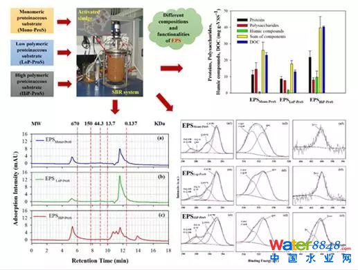 該論文系統(tǒng)考察了污水中單體態(tài)、低聚合態(tài)和高聚合態(tài)底物對活性污泥系統(tǒng)中胞外聚合物(EPS)化學(xué)組分和官能團(tuán)組成的影響特征。研究結(jié)果顯示,底物聚合程度的提高顯著改變了EPS的化學(xué)成分和官能團(tuán)組成,使蛋白質(zhì)相關(guān)官能團(tuán)的比例(如:–CO–NH–,C=O,N–C,N–H)顯著增加,而多糖相關(guān)官能團(tuán)的比例(如:C–O–C,C–O–H,O=C–OH)顯著降低。此外,EPS中腐殖酸類物質(zhì)的比例增加近6~16倍之多,表明了EPS中腐殖酸類物質(zhì)與底物水解過程的相關(guān)關(guān)系;瘜W(xué)組分和官能團(tuán)組成的改變,也導(dǎo)致EPS的物理化學(xué)特性發(fā)生了顯著的變化。由于EPS的物理化學(xué)特性與活性污泥的結(jié)構(gòu)和性質(zhì)有著密切的聯(lián)系,也對當(dāng)前剩余污泥處理問題以及膜生物反應(yīng)器中膜污染問題有重要影響,論文對理解污水中聚合態(tài)底物如何影響污泥特性以及后續(xù)的污泥處理和膜污染問題具有重要意義。