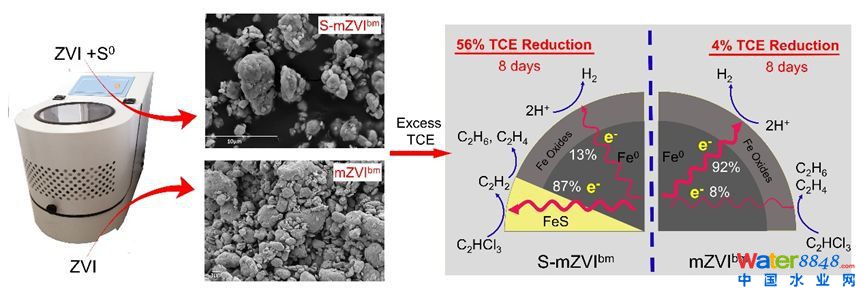 該研究首次報(bào)道了使用機(jī)械化學(xué)方法合成硫化微米零價(jià)鐵(S-mZVI),克服了現(xiàn)有液相化學(xué)方法硫化納米零價(jià)鐵存在的諸多技術(shù)缺陷,為硫化零價(jià)鐵的規(guī);珊蛻(yīng)用提供了新的技術(shù)途徑。該研究還提出了一種電子利用效率的準(zhǔn)確計(jì)算方法,系統(tǒng)評價(jià)了S-mZVI降解三氯乙烯的反應(yīng)途徑、動力學(xué)、電子效率以及降解容量,并與美國Oregon Health & Science University合作使用電化學(xué)手段探究了S-mZVI降解三氯乙烯的增效機(jī)制,為硫化零價(jià)鐵的研究提供了多種借鑒手段。