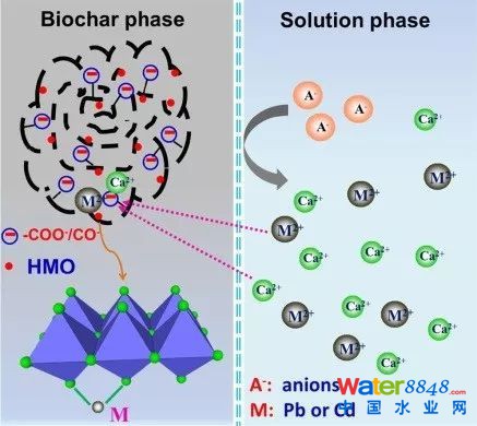 該研究將水合氧化錳(HMO)納米顆粒浸漬在花生殼燒制的生物炭(BC)中,得到性能優(yōu)良的納米復(fù)合吸附劑HMO-BC。HMO-BC可以在較寬泛的pH值范圍內(nèi)(3~7)可有效絡(luò)合Pb()及Cd(),且HMO-BC在存在強(qiáng)競爭陽離子的情況下吸附能力比純BC更優(yōu)。復(fù)合吸附劑中BC的存在顯著降低了在酸性pH條件下Mn的浸出。嵌入式的HMO納米顆粒有利于目標(biāo)陽離子的內(nèi)球絡(luò)合,正如XPS光譜所示,與BC結(jié)合的非擴(kuò)散性的帶負(fù)電的含氧基團(tuán)通過Donnan膜效應(yīng)使Pb()及Cd()預(yù)先富集和滲透到孔道中,實(shí)現(xiàn)重金屬陽離子的優(yōu)先吸附。本實(shí)驗(yàn)克服了單獨(dú)應(yīng)用HMO或BC處理含重金屬廢水的技術(shù)障礙。