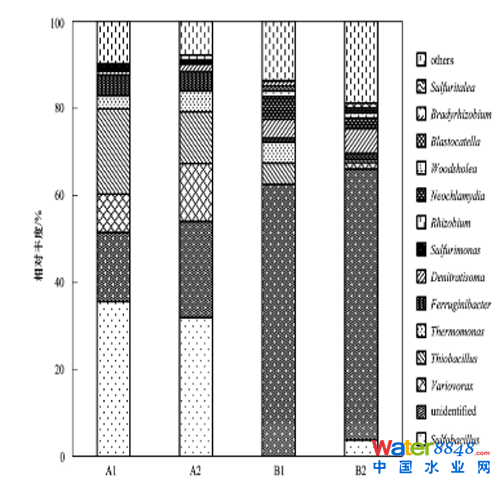 Chao指數(shù)和Shannon指數(shù)表示微生物群落結(jié)構(gòu)的變化。群落豐富度用Chao指數(shù)描述,其值越高表明群落物種的豐富度越高;Shannon指數(shù)可以反映樣品的多樣性程度,其值越高表明群落物種的多樣性越高。 表 2顯示,4個污泥樣品的Chao和Shannon指數(shù)均為A2>A1>B2>B1.結(jié)果表明,1號反應器中的物種豐度和多樣性均高于2號反應器。分析原因,主要是黃鐵礦/白云石反應器(2號) 中所用硫源為黃鐵礦,其硫含量低于硫磺。這使得硫磺/白云石反應器(1號) 中的硫自養(yǎng)反硝化菌群因得到充足基質(zhì)而更好的生長。即由于基質(zhì)含量的不同,黃鐵礦/白云石反應器中的自養(yǎng)反硝化菌種的生長受到一定的限制。另一方面,經(jīng)過30 d的饑餓忍耐后,硫磺/白云石和黃鐵礦白云石2個反應器中微生物豐富度和多樣性明顯低于恢復期。分析原因,主要是饑餓期部分微生物對饑餓環(huán)境的忍耐能力差,裂解死亡,部分細菌因營養(yǎng)物質(zhì)缺乏而進入休眠狀態(tài);恢復期生物膜的活性和生長可得到不同程度的恢復。這與上述反應器中微生物量饑餓期低于恢復期的變化是一致的。