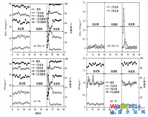 反應器穩(wěn)定運行后,停止進水,進入饑餓期。經(jīng)過30 d的饑餓忍耐后,反應器在低溫下(14℃) 恢復進水,進入恢復期。由圖 2可以看出,饑餓忍耐后,1號反應器出水NO3--N增加到27.87 mg˙L-1,2號反應器出水NO3--N增加到26.56 mg˙L-1.但隨著反應器的恢復,出水NO3--N濃度逐漸降低,1號反應器經(jīng)5 d的恢復(第65 d),出水NO3--N和TN濃度分別為0.38 mg˙L-1和2.37 mg˙L-1,去除率分別為98.8%和93.6%;2號反應器經(jīng)11 d的恢復(第71 d),出水NO3--N和TN濃度分別為10.51 mg˙L-1和12.91 mg˙L-1,去除率為66.40%和65.57%.其次,在恢復期2個反應器的出水NO2--N濃度均呈現(xiàn)先增加后降低的趨勢,恢復初期均出現(xiàn)NO2--N的積累。由圖 2可知,1號反應器恢復期第3 d (第63 d) 出水NO2--N濃度為2.17 mg˙L-1;2號反應器恢復期第5 d(第65 d),出水NO2--N濃度為0.37 mg˙L-1.隨著反應器穩(wěn)定運行,最終1號反應器NO2--N濃度下降到0.1 mg˙L-1以下,2號反應器有0.1 mg˙L-1 NO2--N的積累量。此外,饑餓忍耐未對2號反應器TP的去除效果產(chǎn)生明顯的影響。原因如下,2號反應器對磷的去除主要是通過黃鐵礦中的鐵與磷結(jié)合形成鐵磷沉淀物及鐵的氧化物和氫氧化物對磷有吸附作用,饑餓條件下并未明顯影響這一物理化學過程。結(jié)果表明,與1號反應器相比,2號反應器的恢復時間略長,但2個反應器都能在低溫、短期內(nèi)恢復到正常處理效果。