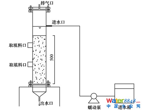 硫自養(yǎng)反硝化工藝采用降流式生物濾池,試驗裝置示意圖如圖 1所示。反應器為密封的有機玻璃柱,內(nèi)徑140 mm,高度1 170 mm,填充高度500 mm,有效容積5.94 L.進水口距柱底600 mm,沿反應器不同高度處分別設置取填料口,取填料口距填料頂部的距離分別是100 mm和300 mm。