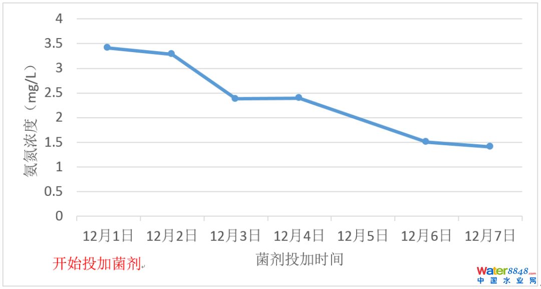 南湖原水體氨氮濃度較高(3-5 mg/L,局部區(qū)域>7 mg/L)。為快速降低水體氨氮濃度,在種植沉水植物后持續(xù)投加活化硝化細(xì)菌及芽孢桿菌,硝化細(xì)菌以水草為載體得以較好生長并有效降低水中氨氮濃度。