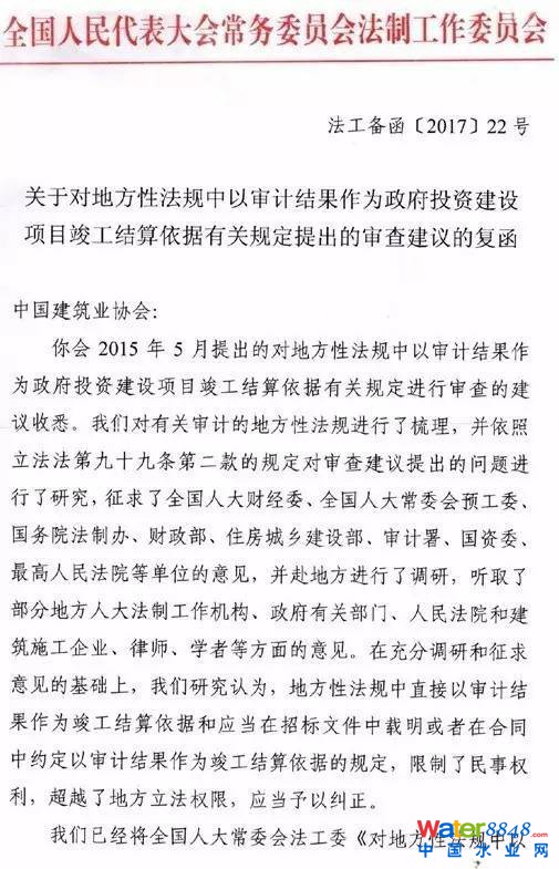 6月5日,法工委復(fù)函《關(guān)于對(duì)地方性法規(guī)中以審計(jì)結(jié)果作為政府投資建設(shè)項(xiàng)目竣工結(jié)算依據(jù)有關(guān)規(guī)定提出的審查建議的復(fù)函》。該復(fù)函提出,經(jīng)過充分調(diào)研和征求意見,認(rèn)為地方性法規(guī)中直接以審計(jì)結(jié)果作為竣工結(jié)算依據(jù)和應(yīng)當(dāng)在招標(biāo)文件中載明或者在合同中約定以審計(jì)結(jié)果作為竣工結(jié)算依據(jù)的規(guī)定,限制了民事權(quán)利,超越了地方立法權(quán)限,應(yīng)當(dāng)予以糾正。