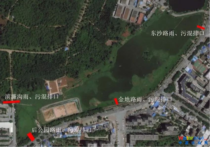 金牛嶺被譽(yù)為?谥危鹋:挥诮鹋X公園內(nèi)是?谥蔚姆稳~。金牛湖建于1992年,占地面積約19.8萬m2,總庫容103萬m3,分南、北兩湖,其中南湖面積約6萬m2,平均水深2.0 m;南湖作為金牛湖的前置湖,接納了90%以上的入湖污染,曾經(jīng)是水葫蘆肆意生長的污水塘,水質(zhì)為劣V類。2016年5月鐵漢生態(tài)聯(lián)合中標(biāo)?谑旋埨、東西湖、金牛湖等11個(gè)黑臭水體的治理項(xiàng)目,開始了金牛湖的綜合治理之路。