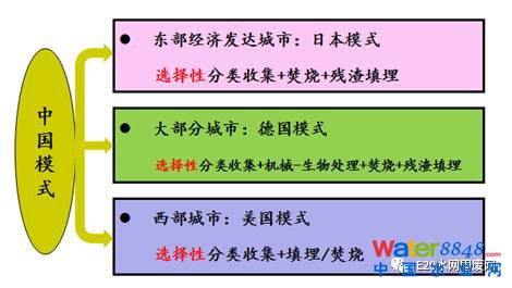綜上,我認為,中國的生活垃圾處理模式大致可分為如下幾種情況:發(fā)達的地方,使用日本模式,就是選擇性分類收集+焚燒+填埋;大部分的城市可以選擇德國模式,選擇性分類收集+機械-生物的處理+焚燒+殘渣填埋;西部城市可用美國模式,選擇性分類收集+填埋/焚燒。為什么叫選擇性分類收集呢?這就包含了我國自己的特色,把有害的、有用的部分適當?shù)胤殖鋈,不是說都要分出來,而是前端適度地分類。比如講廚余垃圾分出10%,對于處理系統(tǒng)效率的提升可能就有足夠的效果了,若要求分出50%沒可能只是虛高的指標,分出來的還是混合垃圾。