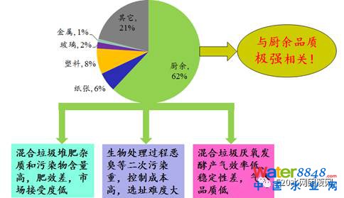 大家給予厚望的生物處理技術(shù)同樣面臨挑戰(zhàn)。源頭分類很難,分類效果差,依賴二次集中分選,增加了處理成本,影響系統(tǒng)穩(wěn)定運行及產(chǎn)品品質(zhì);臭味控制難,進料、分選、堆肥等環(huán)節(jié)惡臭釋放量大成分復(fù)雜,控制成本高占地面積大;土地利用難,堆肥及沼渣沼液土地利用存在諸多限制,市場接受度低,許多情況下仍然需要當做廢物處理;持續(xù)盈利難,產(chǎn)品非標準化產(chǎn)品,品質(zhì)相對較低,附加值較低,盈利模式不清晰。這些問題產(chǎn)生的根源與大量的廚余垃圾有著極強的關(guān)系。