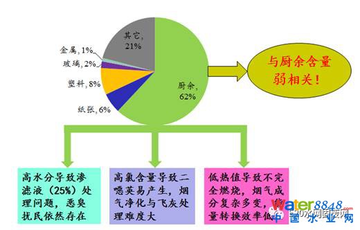 分技術(shù)路線來看,衛(wèi)生填埋方面,由于占地面積大,在很多城市的選址越來越難;由于滲濾液產(chǎn)生量大,污染負荷高,處理標準嚴、難度大、成本高;惡臭污染嚴重,控制難度大;填埋產(chǎn)氣不穩(wěn)定,甲烷含量低,收集利用難度大,溫室氣體排放量大;填埋場積水嚴重,水位雍高,安全隱患大。這些問題產(chǎn)生的根源在于我國生活垃圾的高水分、高廚余的特點,項目運營得再好,很多問題也是不可避免的。