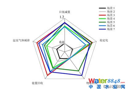 針對這七種情形,采用5個評估指標:減量化率;穩(wěn)定化率(處理徹底性);物質(zhì)回收;能量回收;溫室氣體減排。評估結(jié)果表明: