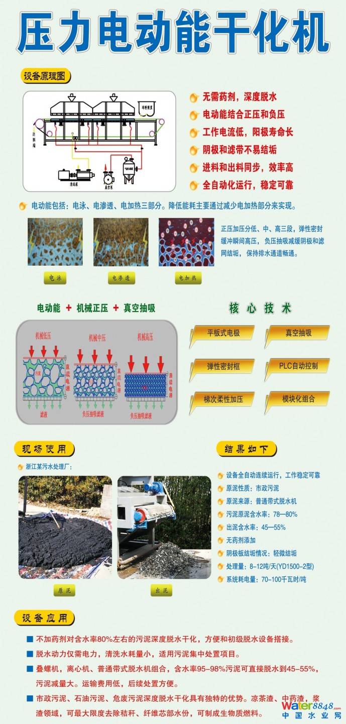 核心提示: 壓力電動能干化機(電滲透技術(shù)) 壓力電動能干化脫水機是我公司自主研發(fā)的新一代脫水干化設(shè)備。在不添加任何藥劑的情況下,將生化污泥等難處理的污泥脫水至含水率45-55%。該技術(shù)已申請多項國家發(fā)明專利。